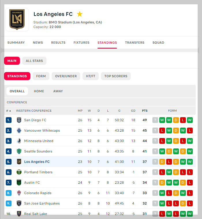 MLS 플레이오프는 10월부터 시작. LAFC는 현재 서부 5위로 포스트시즌 진출을 노린다.