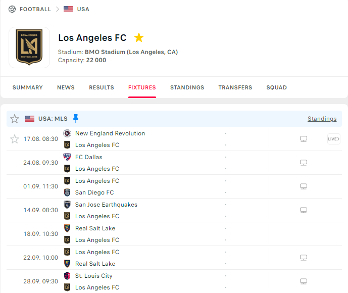 - 9/22(월) 10:00 KST — LAFC vs Real Salt Lake @ BMO Stadium(LA) · 미국시간 9/21(일) 6:00 PM PT